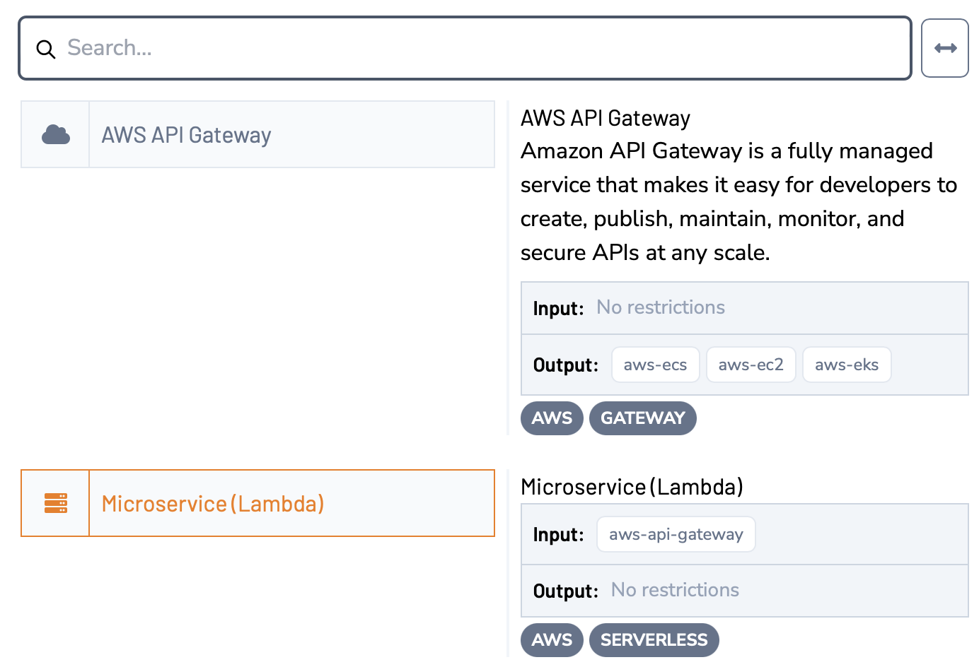 Simplify tool and technology discovery for your teams. Our comprehensive component library enables developers to easily find and explore available microservices, compute servers, databases, file storage, and more.